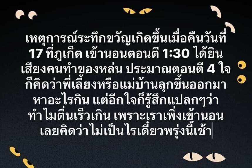 เหตุการณ์ระทึกขวัญเกิดขึ้นเมื่อคืนวันที่ 17 ที่ภูเก็ต เข้านอนตอนตี 1:30 ได้ยินเสียงคนทำของหล่น ประมาณตอนตี 4 ใจก็คิดว่าพี่เลี้ยงหรือแม่บ้านลุกขึ้นออกมาหาอะไรกิน แต่อีกใจก็รู้สึกแปลกๆ ว่าทำไมตื่นเร็วเกิน เพราะเราเพิ่งเข้านอนเลยคิดว่าไม่เป็นไรเดี๋ยวพรุ่งเช้า ตื่นมาถามก็ได้