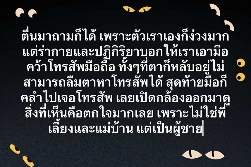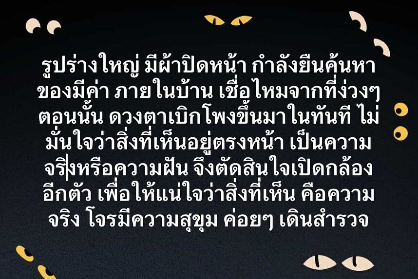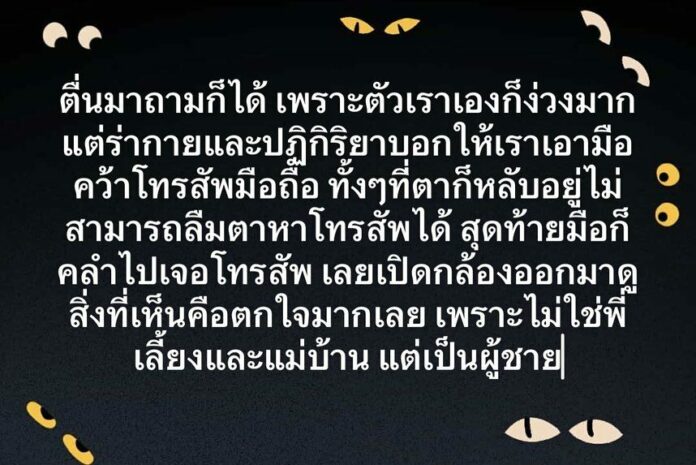 เพราะตัวเราเองก็ง่วงมากแต่ร่างกายและปฏิกิริยาบอกให้เราเอามือคว้าโทรศัพ์มือถือ ทั้งๆที่ตาก็หลับอยู่ไม่สามารถลืมตาหาโทรศัพท์ได้ สุดท้ายมือก็คลำไปเจอโทรศัพท์ เลยเปิดกล้องออกมาดูสิ่งที่เห็นคือตกใจมากเลย เพราะไม่ใช่พี่เลี้ยงและแม่บ้าน แต่เป็นผู้ชายรูปร่างใหญ่