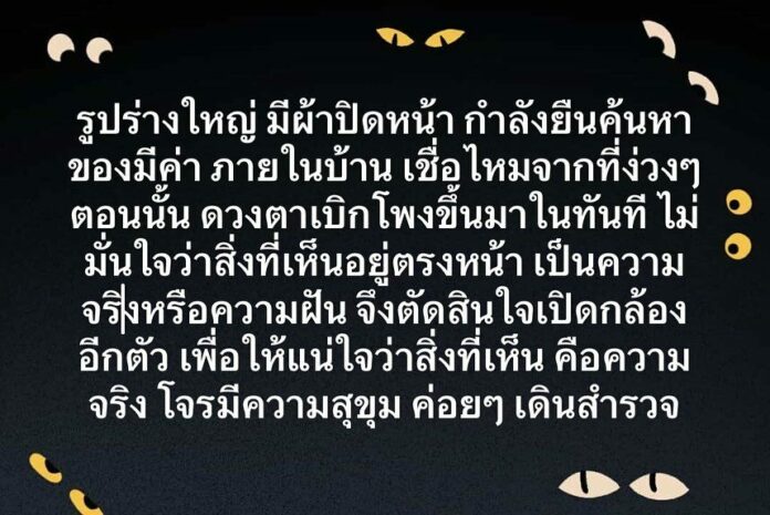 มีผ้าปิดหน้า กำลังยืนค้นหาของมีค่า ภายในบ้าน เชื่อไหมจากที่ง่วงๆ ตอนนั้น ดวงตาเพิกโพงขึ้นมาในทันที ไม่มั่นใจว่าสิ่งที่เห็นอยู่ตรงหน้า เป็นความจริงหรือความฝัน จึงตัดสินใจเปิดกล้องอีกตัว เพื่อให้แน่ใจว่าสิ่งที่เห็น คือความจริง โจรมีความสุขุม ค่อยๆ เดินสำรวจทรัพย์สินและส่งของมีค่าภายในบ้านอย่างสุขุม