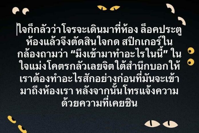 ใจก็กลัวว่าโจรจะเดินมาที่ห้อง ล็อคประตูห้องแล้วจึงตัดสินใจกด สปิกเกอร์ในกล้องถามว่า “มึงเข้ามาทำอะไรในนี้” ในใจแม่งโคตรกลัวเลยจิตใต้สำนึกบอกให้เราต้องทำอะไรสักอย่างก่อนที่มันจะเข้ามาถึงห้องเรา หลังจากนั้นโทรแจ้งความ