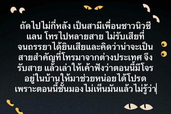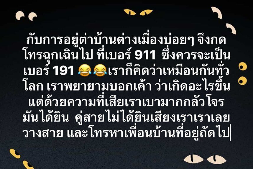 ด้วยความที่เคยชินกับการอยู่ต่างบ้านต่างเมืองบ่อยๆ จึงกดโทรฉุกเฉินไปเบอร์ 911 ซึ่งควรจะเป็นเบอร์ 191 เราก็คิดว่าเหมือนกันทั่วโลก เราพยายามบอกเขาว่าเกิดอะไรขึ้น แต่ด้วยความที่เสียงเราเบามาก กลัวโจรมันได้ยิน คู่สายไม่ได้ยินเสียงเรา เราเลยวางสาย และโทรหาเพื่อนบ้านที่อยู่ถัดไป ไม่กี่หลัง เป็นสามีเพื่อนชาวนิวซีแลนด์