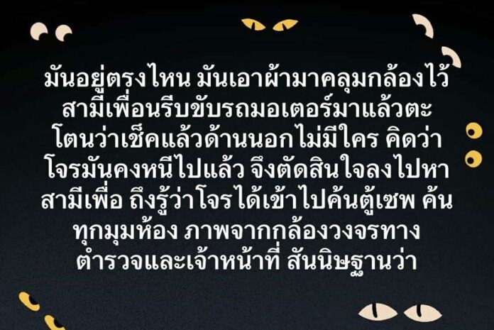 สามีเพื่อนรีบขับรถมอเตอร์มาแล้วตะโกนว่าเช็คแล้วด้านนอกไม่มีใคร คิดว่าโจรมันหนีไปแล้ว จึงตัดสินใจลงมาไปหาสามีเพื่อน ถึงรู้ว่าโจรได้เข้าไปค้นตู้เซพ ค้นทุกมุมห้อง ภาพจากกล้องวงจรทางตำรวจและเจ้าหน้าที่ สันนิษฐานว่า