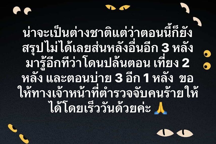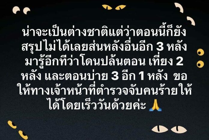 น่าจะเป็นต่างชาติแต่ว่าตอนนี้ก็ยังสรุปไม่ได้เลย ส่วนหลังอื่นๆอีก 3 หลังมารู้อีทีว่าโดนปล้นตอนเที่ยง 2 หลัง แตอนบ่าย 3 อีก 1 หลัง ขอให้เจ้าหน้าที่ตำรวจจับคนร้ายให้ได้โดยเร็ววันด้วยค่ะ