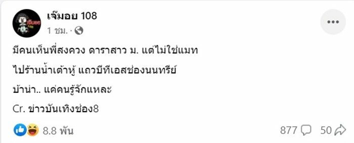 หลังจากเพจเจ๊มอย 108 โพสต์ประโยคสะดุ้งกันทั้งโซเชียลว่า “มีคนเห็นพี่สงควง ดาราสาว ม. แต่ไม่ใช่แมท ไปร้านน้ำเต้าหู้ แถวบีทีเอสช่องนนทรีย์ บ้าน่า.. แค่คนรู้จักแหละ Cr. ข่าวบันเทิงช่อง8” ด้านนักสืบโซเชียลคาดเดากันไปต่างๆ นานา ดาราสาว ม. แท้จริงแล้วคือใคร?
