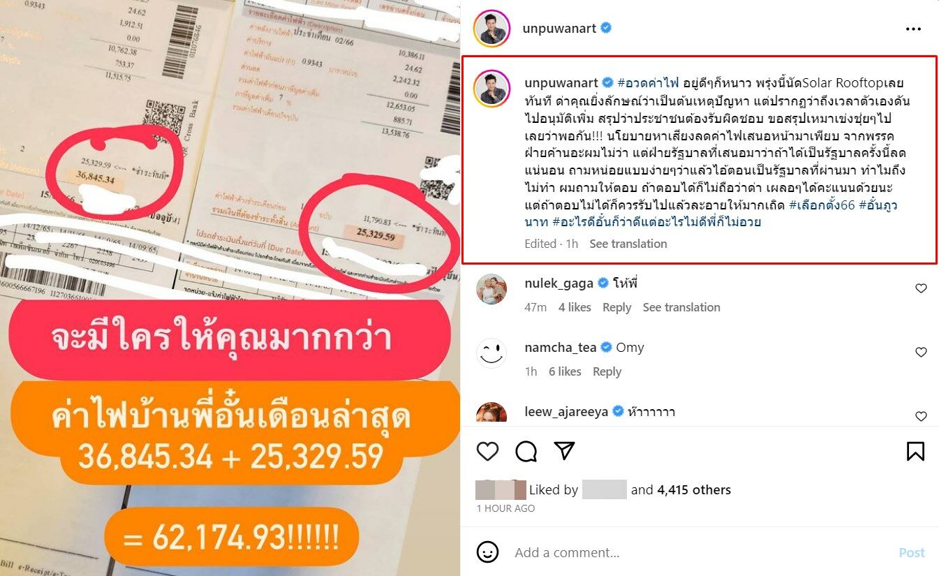งานนี้ อั๋น โพสต์ภาพค่าไฟราคาเกินครึ่งแสน พร้อมข้อความถามเจ็บถึงฝ่ายรัฐบาลที่เคยด่ายิ่งลักษณ์ อดีตนายกเป็นต้นเหตุปัญหาค่าไฟว่า “อวดค่าไฟ อยู่ดีๆก็หนาว พรุ่งนี้นัดSolar Rooftopเลยทันที ด่าคุณยิ่งลักษณ์ว่าเป็นต้นเหตุปัญหา แต่ปรากฏว่าถึงเวลาตัวเองดันไปอนุมัติเพิ่ม