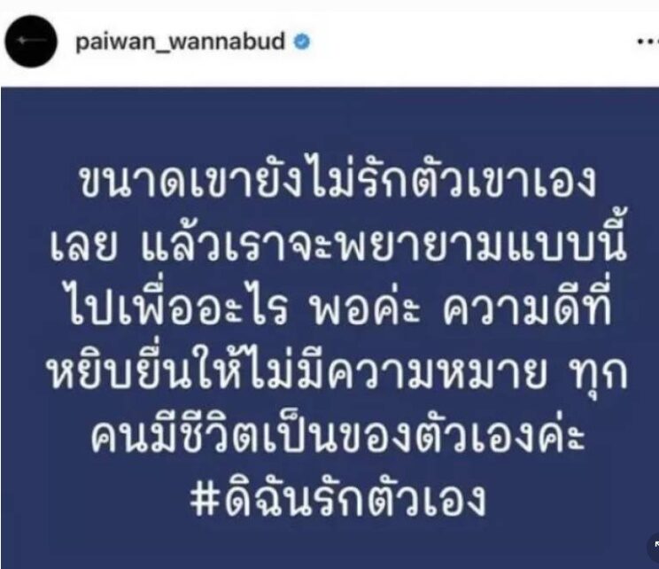 โดย แพรรี่ โพสต์ข้อความว่า “ขนาดเขายังไม่รักตัวเขาเองเลย แล้วเราจะพยายามแบบนี้ ไปเพื่ออะไร พอค่ะ ความดีที่ หยิบยื่นให้ไม่มีความหมาย ทุกคนมีชีวิตเป็นของตัวเองค่ะ #ดิฉันรักตัวเอง”