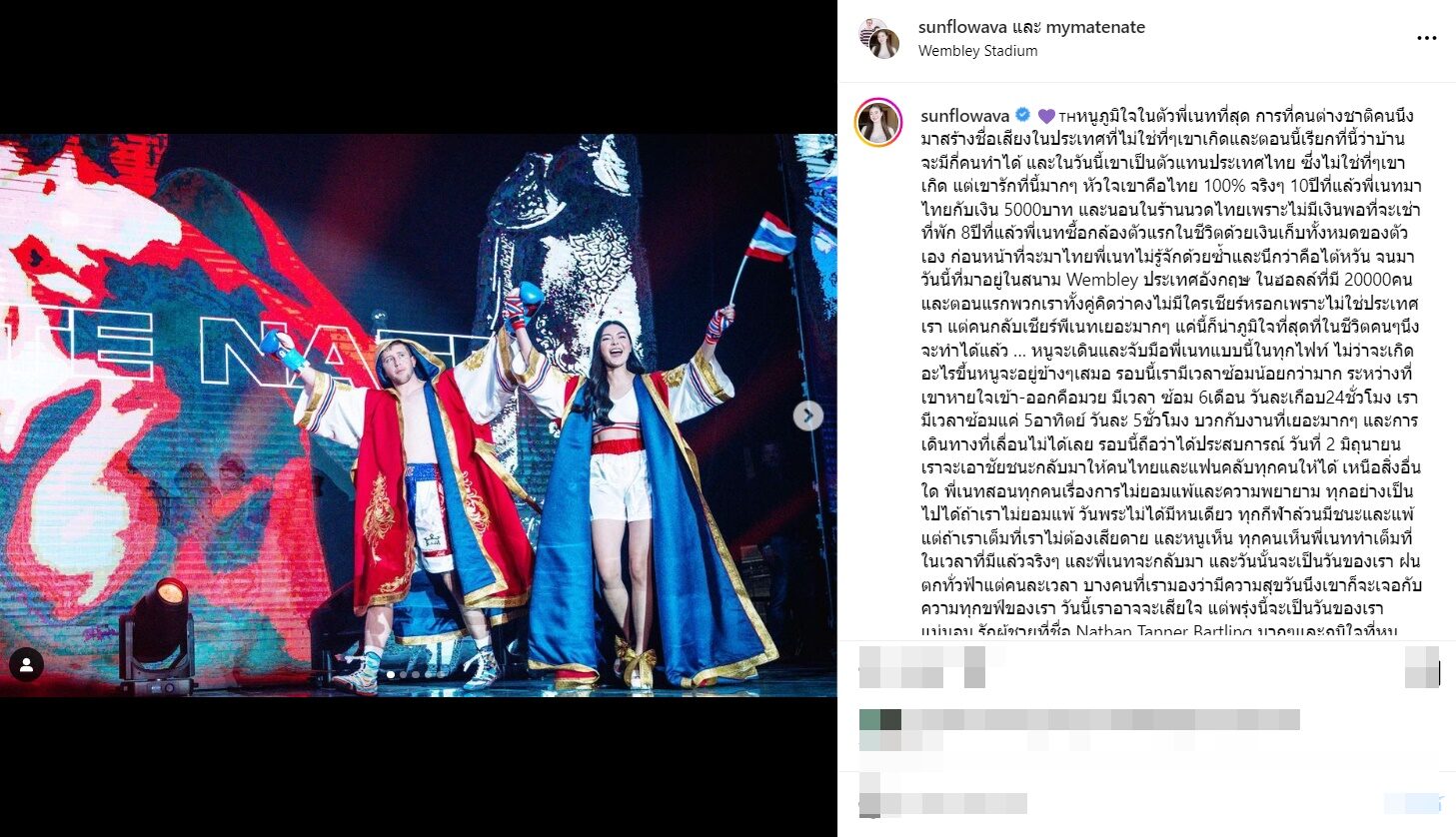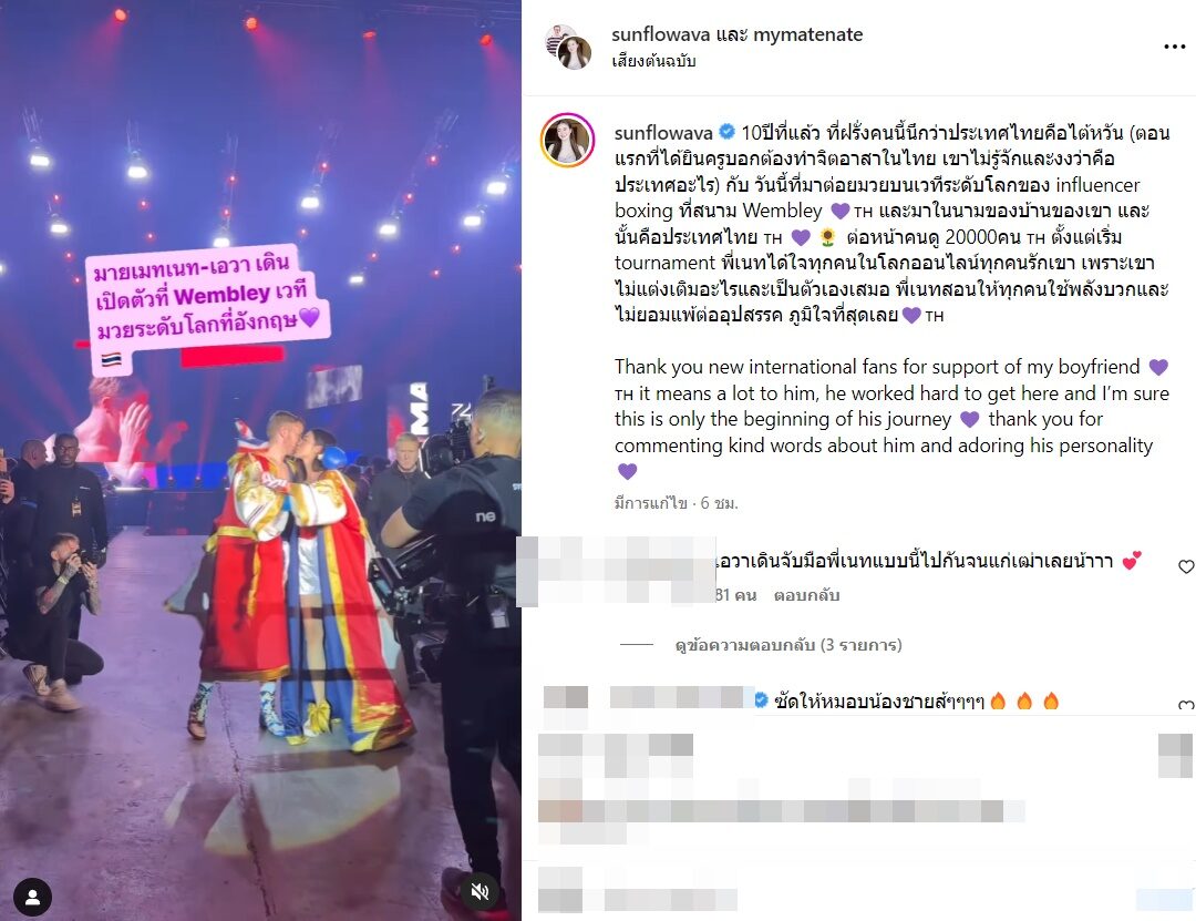 นอกจากนี้ ทั้งคู่ยังได้โพสต์คลิปช่วงเดินเปิดตัว พร้อมกับแคปชั่นว่า “10 ปีที่แล้ว ที่ฝรั่งคนนี้นึกว่าประเทศไทยคือไต้หวัน (ตอนแรกที่ได้ยินครูบอก ต้องทำจิตอาสาในไทย เขาไม่รู้จักและงงว่าคือ ประเทศอะไร) กับวันนี้ที่มาต่อยมวยบนเวทีระดับโลกของ influencer boxing ที่สนาม Wembley และมาในนามของบ้านของเขา และ นั่นคือประเทศไทยต่อหน้าคนดู 20000 คน ตั้งแต่เริ่ม tournament พี่เนทได้ใจทุกคนในโลกออนไลน์ ทุกคนรักเขา เพราะเขาไม่แต่งเติมอะไร และเป็นตัวเองเสมอ พี่เนทสอนให้ทุกคนใช้พลังบวก และไม่ยอมแพ้ต่ออุปสรรค ภูมิใจที่สุดเลย”
