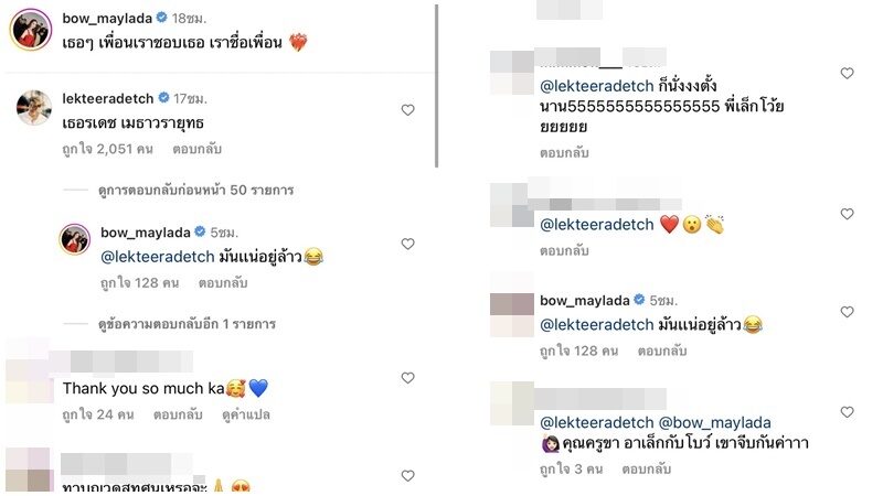 อย่างล่าสุดนี้ สาวโบว์ หยอดอีกแล้ว โดยการโพสต์รูปตนเองลงโซเชียล พร้อมแคปชั่น “เธอๆ เพื่อนเราชอบเธอ เราชื่อเพื่อน ❤️????” ชั่วอึดใจเดียว ไม่วาย หนุ่มอาเล็ก ก็เข้ามาแซว บอกว่า “เธอรเดช เมธาวรายุทธ” แล้ว โบว์ยังมาต่ออีกว่า “มันเเน่อยู่ล้าว????”