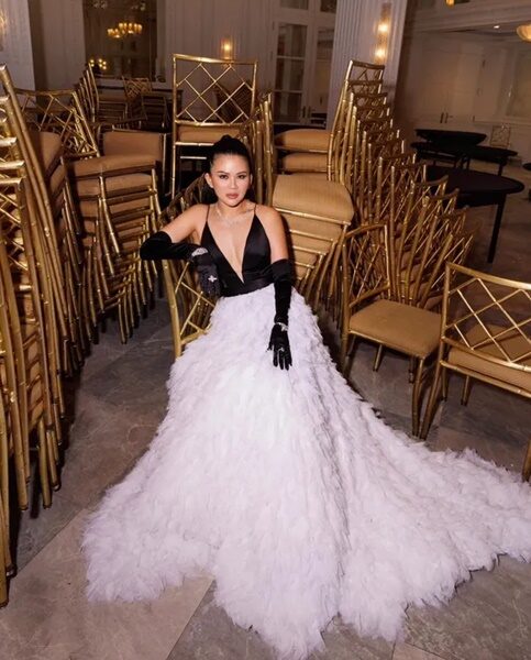 เนื่องจากในปีนี้เธอมาในชุดของแบรนด์หรูอย่าง Louis Vuitton ซึ่งทางแบรนด์บรรจงคัดสรรเลือกให้ พร้อมคงความเอกลักษณ์ความอมตะและคลาสิค กับชุดสองเลเยอร์ ขาว – ดำ ตัดกันแบบลงตัว เนื่องจาก Dress Code ในปีนี้คือ “In honor of Karl.” ที่มีมูลค่าราว 4 ล้านบาท