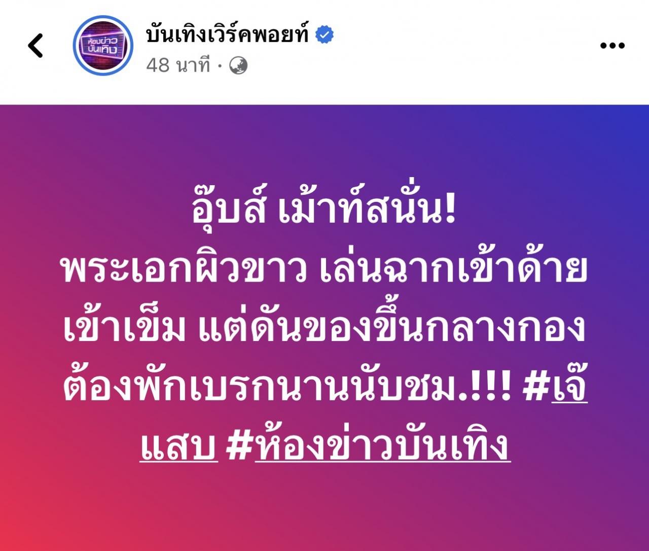 โดยระบุข้อความดังกล่าวว่า “อุ๊บส์ เม้าท์สนั่น! พระเอกผิวขาว เล่นฉากเข้าด้ายเข้าเข็ม แต่ดันของขึ้นกลางกอง ต้องพักเบรกนานนับชม.!!! #เจ๊แสบ #ห้องข่าวบันเทิง”