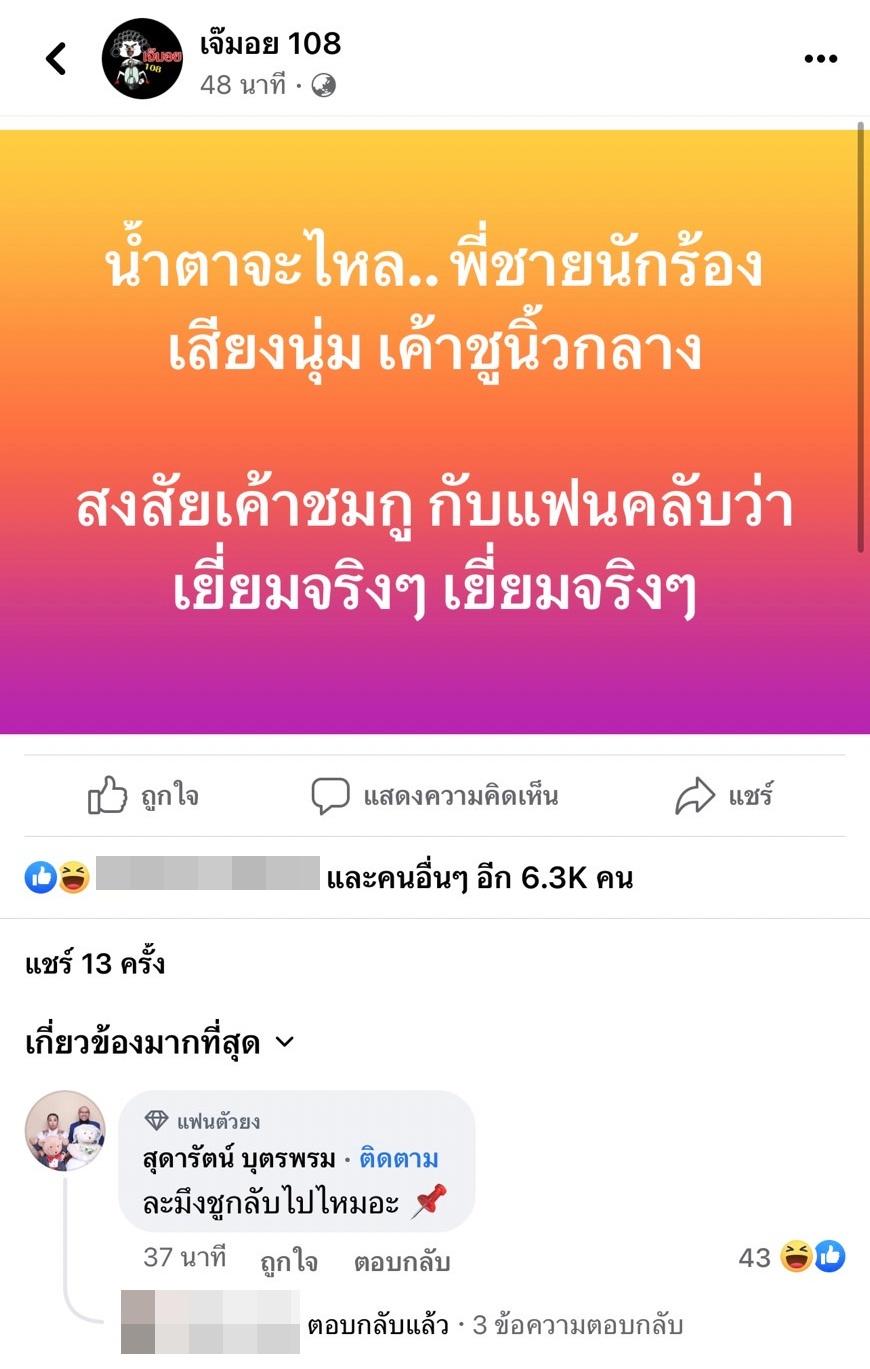 โดยในเพจ เจ๊มอย 108 โพสต์ข้อความในเพจว่า “น้ำตาจะไหล.. พี่ชายนักร้องเสียงนุ่ม เค้าชูนิ้วกลาง สงสัยเค้าชมกู กับแฟนคลับว่า เยี่ยมจริงๆ เยี่ยมจริงๆ”