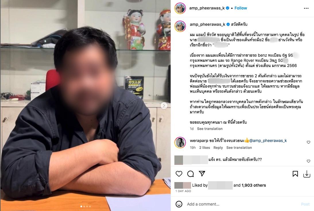 หลังจากที่นักแสดงหนุ่ม แอมป์ พีรวัศ กุลนันท์วัฒน์ โพสต์ไอจีประกาศตามตัวเจ้าของเต็นท์รถแห่งหนึ่ง หลังจากเจ้าตัวและเพื่อนได้ฝากขายรถมือสอง 2 คัน แต่สุดท้ายยังไม่ได้รับเงินจากการขายรถ และติดต่อเจ้าของเต็นท์ไม่ได้