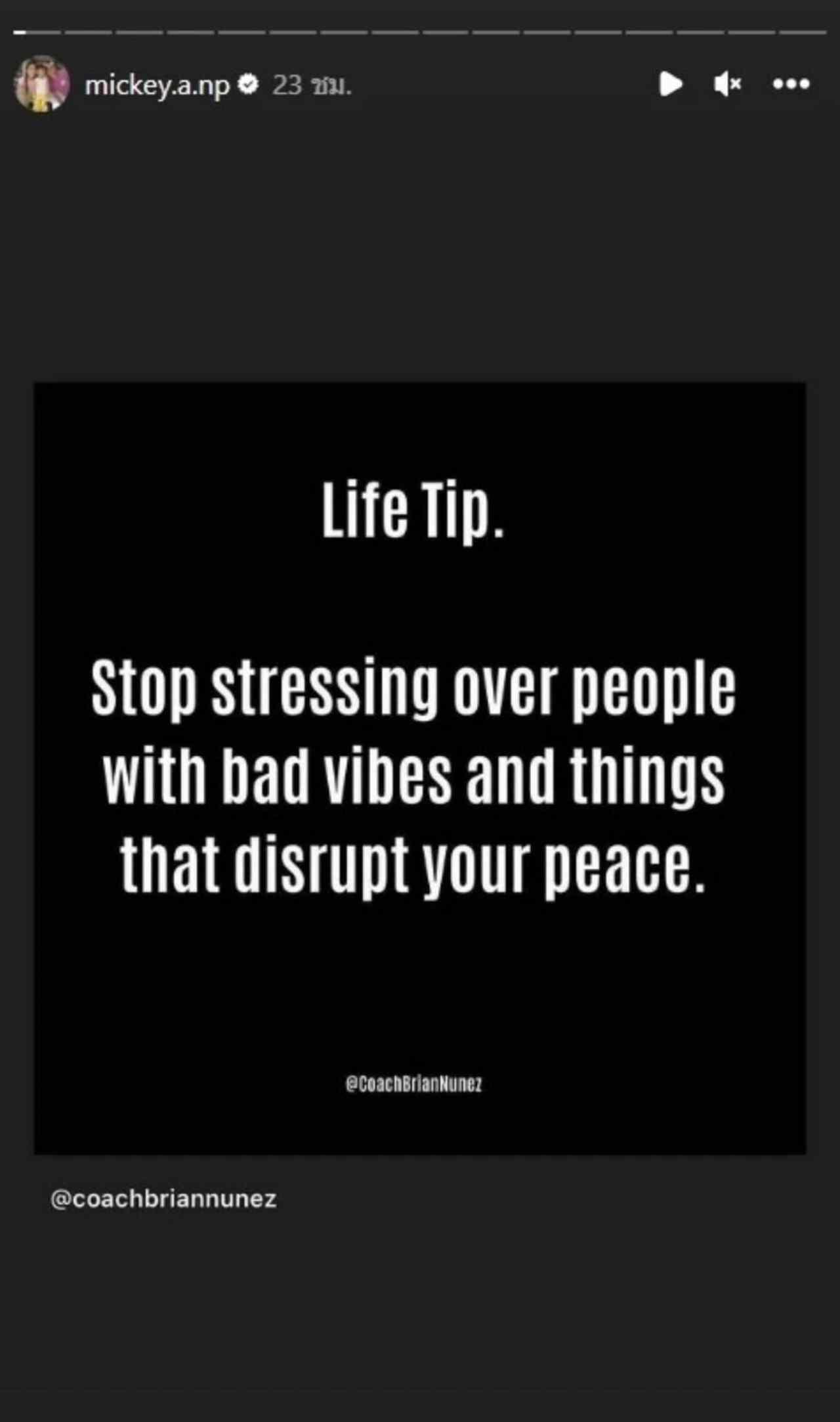 ส่วนทางด้าน มิกกี้ นนท์ อัลภาชน์ สามีของ เจนี่ ก็ได้แชร์ทริกการใช้ชีวิตที่เป็นความภาษาอังกฤษผ่านทางไอจีสตอรี่ของตัวเองเช่นกันว่า “Life Tip. Stop stressing over people with bad vibes and things that disrupt your peace.” (คำแนะนำ : “หยุดเครียดกับคนที่ไม่ดีและสิ่งต่างๆ ที่ทำลายความสงบสุขของคุณ)