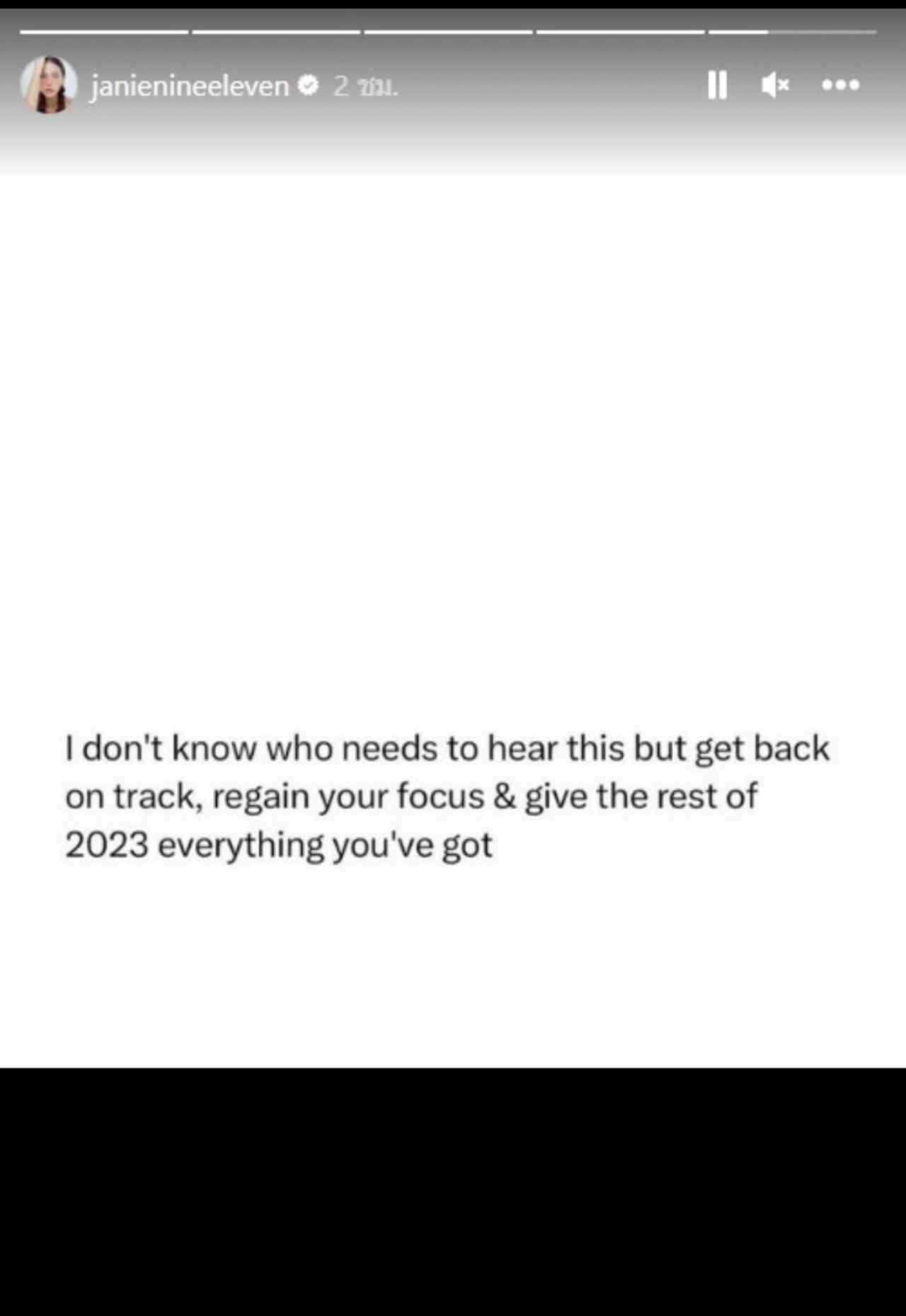ไม่รู้ว่าเกิดอะไรขึ้น อยู่ๆ คุณแม่คนสวย เจนี่ อัลภาชน์ ณ ป้อมเพชร ก็ได้เคลื่อนไหวผ่านทางไอจีสตอรี่ของตัวเองด้วยการโพสต์ข้อความเป็นภาษาอังกฤษเอาไว้ว่า “I don’t know who needs to hear this but get back on track, regain your focus & give the rest of 2023 everything you’ve got” (ฉันไม่รู้ว่าใครบ้างที่ต้องได้ฟังสิ่งนี้ แต่กลับมายังเส้นทางเดิม กลับมาโฟกัสอีกครั้ง และทุ่มทุกอย่างที่มีในปี 2023)
