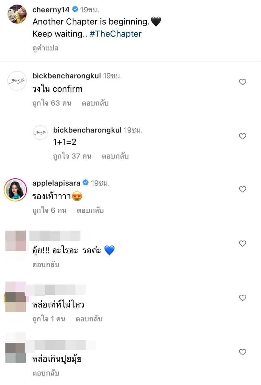 ล่าสุด เชียร์-บิ๊ก ก็มีโมเมนต์ที่ทำเอาแฟนๆ ได้ฟิน เมื่อเชียร์ได้โพสต์ภาพตัวเองในลุคเท่ๆ กับชุดสูทสีดำ พร้อมทั้งเขียนแคปชั่นว่า “Another Chapter is beginning. Keep waiting.. #TheChapter” ซึ่งแปลความได้ว่า “อีกบทกำลังเริ่มต้น รอต่อไป” และงานนี้ บิ๊ก ธนพนธ์ ก็ได้เข้ามาคอมเมนต์ว่า “วงใน confirm” ก่อนจะคอมเมนต์เพิ่มเติมอีกว่า “1+1 = 2”