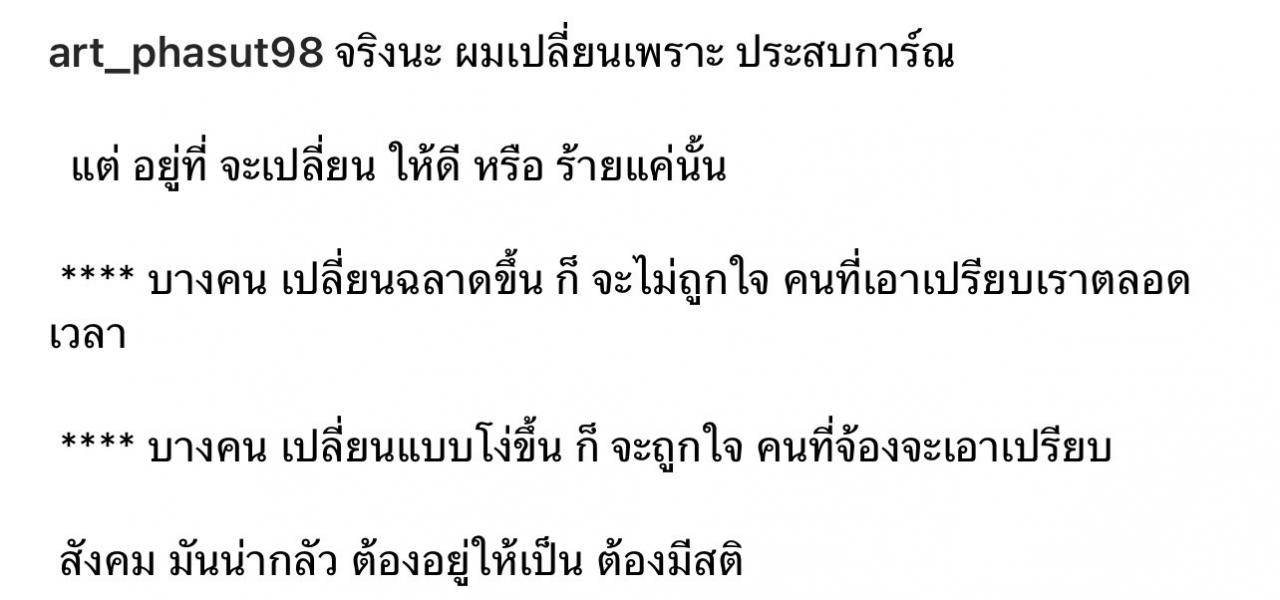 และแคปชั่นที่เจ้าตัวได้เขียนเอาไว้ว่า “จริงนะ ผมเปลี่ยนเพราะประสบการณ์ แต่อยู่ที่จะเปลี่ยนให้ดี หรือร้ายแค่นั้น บางคนเปลี่ยนฉลาดขึ้นก็จะไม่ถูกใจ คนที่เอาเปรียบเราตลอดเวลา บางคนเปลี่ยนแบบโง่ขึ้น ก็จะถูกใจคนที่จ้องจะเอาเปรียบสังคม มันน่ากลัว ต้องอยู่ให้เป็น ต้องมีสติ”.
