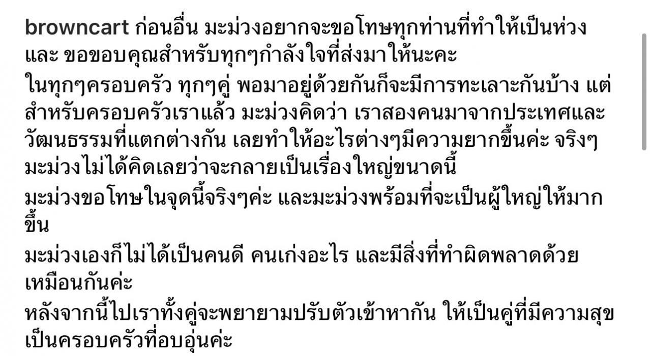 แต่สำหรับครอบครัวเราแล้ว มะม่วงคิดว่า เราสองคนมาจากประเทศและวัฒนธรรมที่แตกต่างกัน เลยทำให้อะไรต่าง ๆ มีความยากขึ้นค่ะ จริง ๆ มะม่วงไม่ได้คิดเลยว่าจะกลายเป็นเรื่องใหญ่ขนาดนี้ มะม่วงขอโทษในจุดนี้จริง ๆ ค่ะ