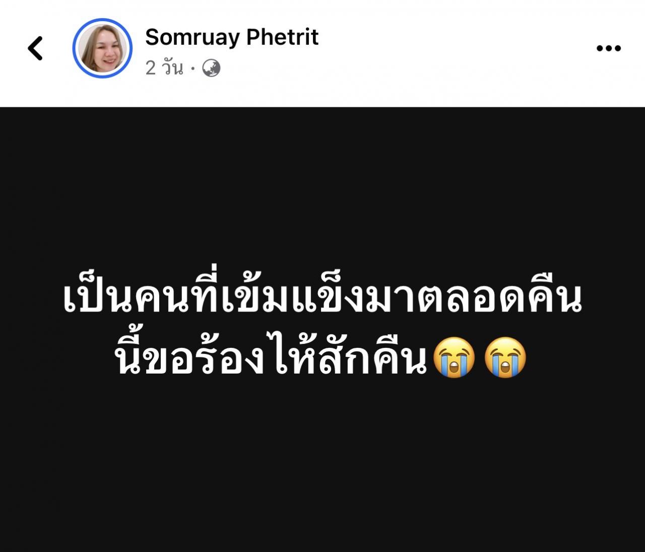 ส่วน แม่เกตุ โพสต์ข้อความพื้นหลังสีดำในเฟซบุ๊ก ระบุข้อความว่า “เป็นคนที่เข้มแข็งมาตลอดคืนนี้ขอร้องไห้สักคืน” ตามด้วยข้อความที่ว่า “ถ้าทุกอย่างมันสายเกินไปก็จงยอมรับสิ่งที่เกิดขึ้น”