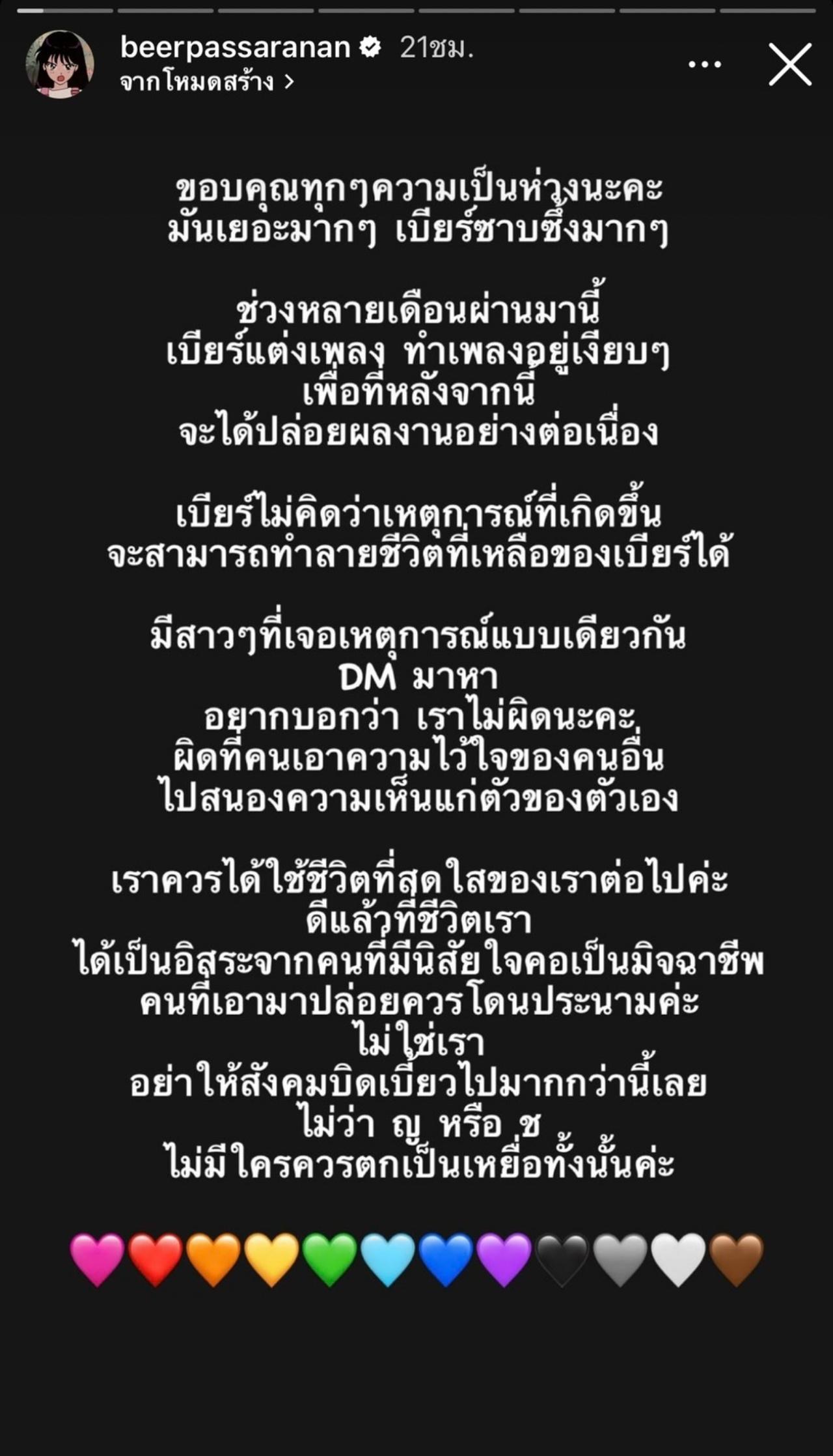 “ขอบคุณทุกๆ ความเป็นห่วงนะคะ มันเยอะมากๆ เบียร์ซาบซึ้งมากๆ ช่วงหลายเดือนผ่านมานี้เบียร์แต่งเพลง ทำเพลงอยู่เงียบๆ เพื่อที่หลังจากนี้จะได้ปล่อยผลงานอย่างต่อเนื่อง