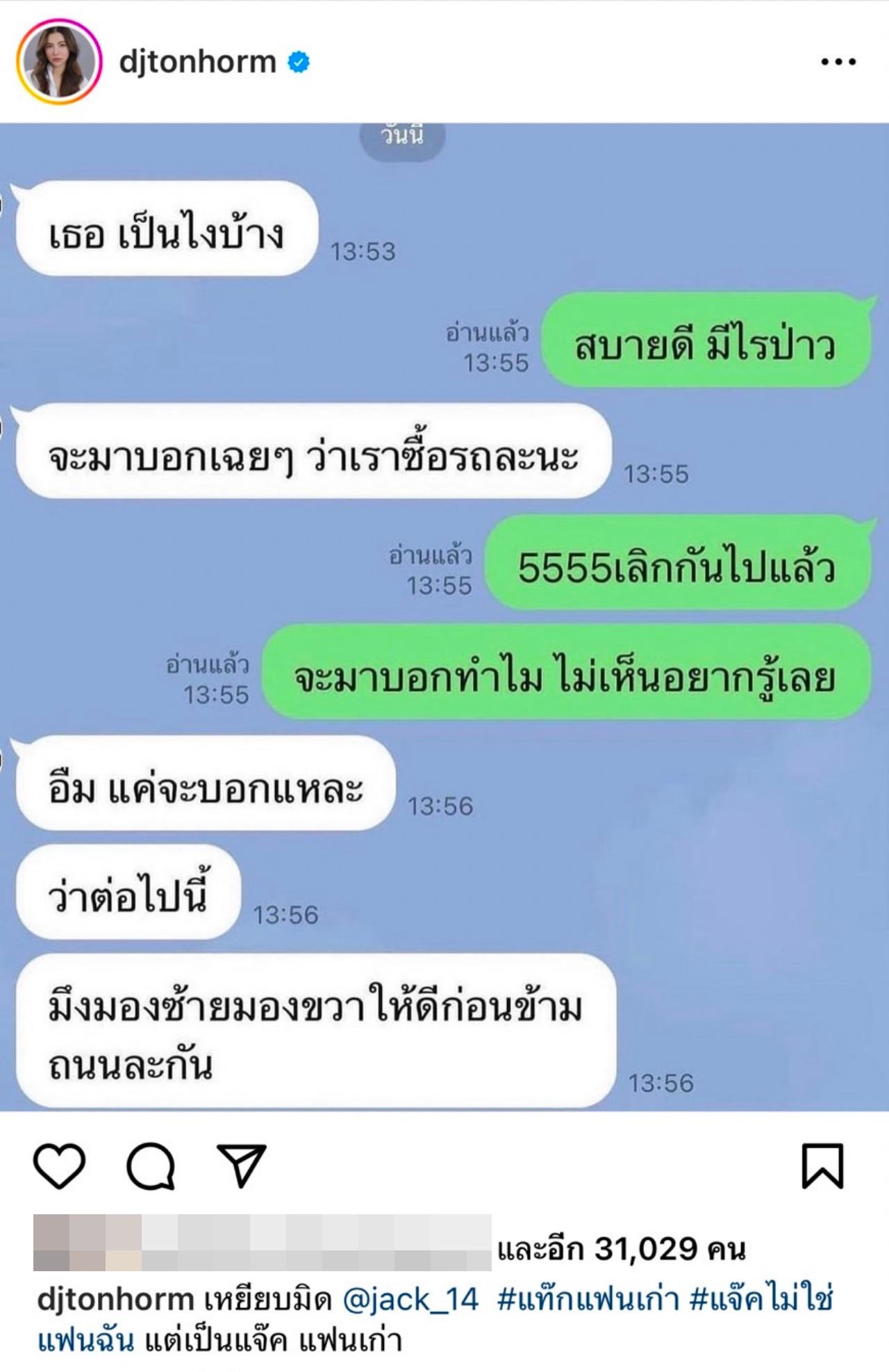 และเขียนแคปชั่นว่า “เหยียบมิด @jack_14 #แท็กแฟนเก่า #แจ๊คไม่ใช่แฟนฉัน แต่เป็นแจ๊ค แฟนเก่า” ทางด้านอดีตแฟนหนุ่มก็ได้เข้ามาคอมเมนต์ว่า “นมใหม่ หน้าใหม่ อย่าคิดว่าจะทำไรกุได้ รำแคม!!”