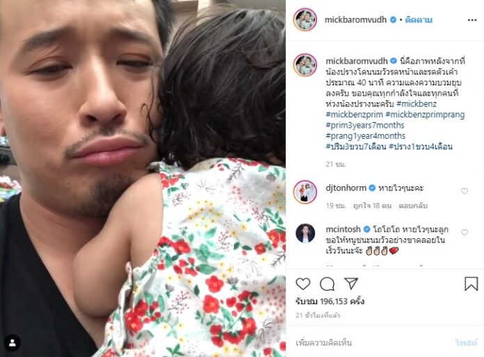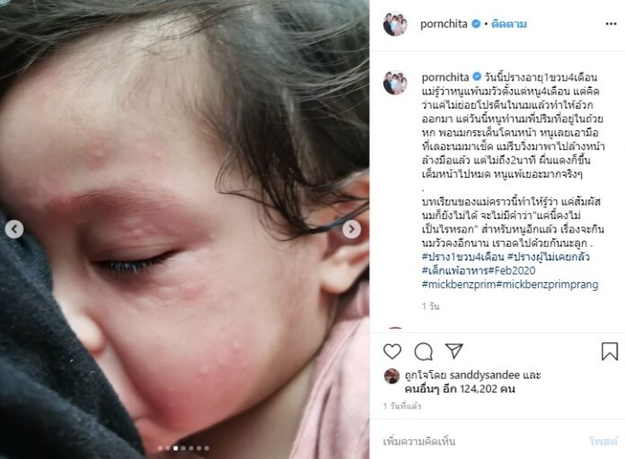 บทเรียนของแม่คราวนี้ทำให้รู้ว่า แค่สัมผัสนมก็ยังไม่ได้ จะไม่มีคำว่า”แค่นี้คงไม่เป็นไรหรอก” สำหรับหนูอีกแล้ว เรื่องจะกินนมวัวคงอีกนาน เราอดไปด้วยกันนะลูก #ปราง1ขวบ4เดือน #ปรางผู้ไม่เคยกลัว #เด็กแพ้อาหาร #Feb2020 #mickbenzprim #mickbenzprimprang” โดยมีคนในวงการแห่คอมเมนต์ เห็นแล้วสงสารเด็กน้อย พร้อมแห่ให้กำลังใจให้น้องปรางหายไวๆ