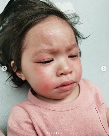 แต่วันนี้หนูทำนมพี่ปริมที่อยู่ในถ้วยหก พอนมกระเด็นโดนหน้า หนูเลยเอามือที่เลอะนมมาเช็ด แม่รีบวิ่งมาพาไปล้างหน้าล้างมือแล้ว แต่ไม่ถึง2นาที ผื่นแดงก็ขึ้นเต็มหน้าไปหมด หนูแพ้เยอะมากจริงๆ