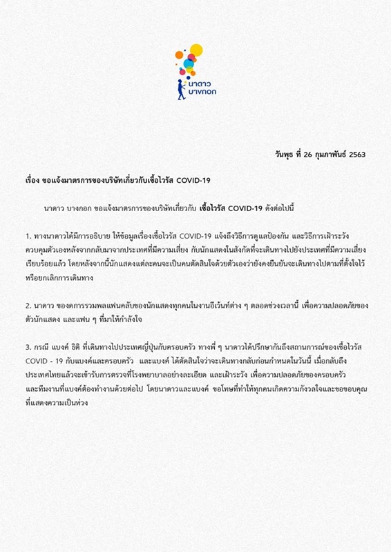 จากกรณีที่ บริษัท นาดาว บางกอก จำกัด ได้ออกมาโพสต์ข้อความผ่านทวิตเตอร์ Nadao Bangkok เผยมาตรการป้องกันไวรัสโควิด-19 รวมถึงชี้แจงประเด็นที่ดาราหนุ่ม แบงค์ ธิติ มหาโยธารักษ์ ได้พาครอบครัวไปเที่ยวประเทศญี่ปุ่น โดยได้สั่งให้ดาราในสังกัดบินกลับประเทศไทยก่อนกำหนด เนื่องจากญี่ปุ่นเป็นหนึ่งในประเทศที่มีความเสี่ยงต่อการติดเชื้อไวรัสดังกล่าวค่อนข้างสูง ตามที่เป็นข่าวไปแล้วเมื่อวานนี้(26ก.พ.)