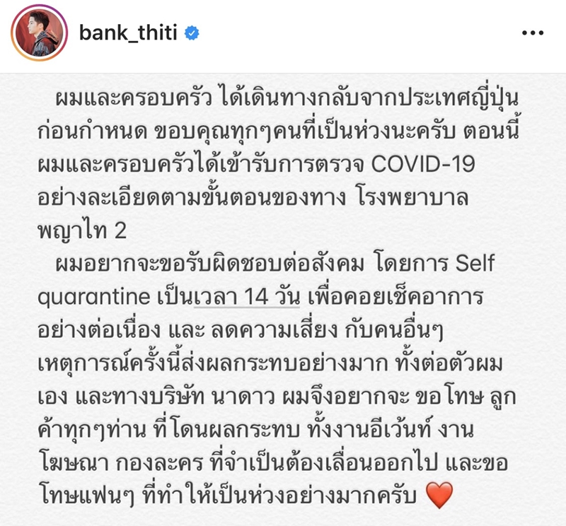 ล่าสุดวันที่ 27 ก.พ. แบงค์ ธิติ ได้โพสต์ข้อความภาพลงไอจี ใจความว่า “ผมและครอบครัวได้เดินทางกลับจากประเทศญี่ปุ่นก่อนกำหนด ขอบคุณทุกๆ คนที่เป็นห่วงนะครับ ตอนนี้ผมและครอบครัวได้เข้ารับการตรวจ COVID-19 อย่างละเอียดตามขั้นตอนของโรงพยาบาลพญาไท 2”