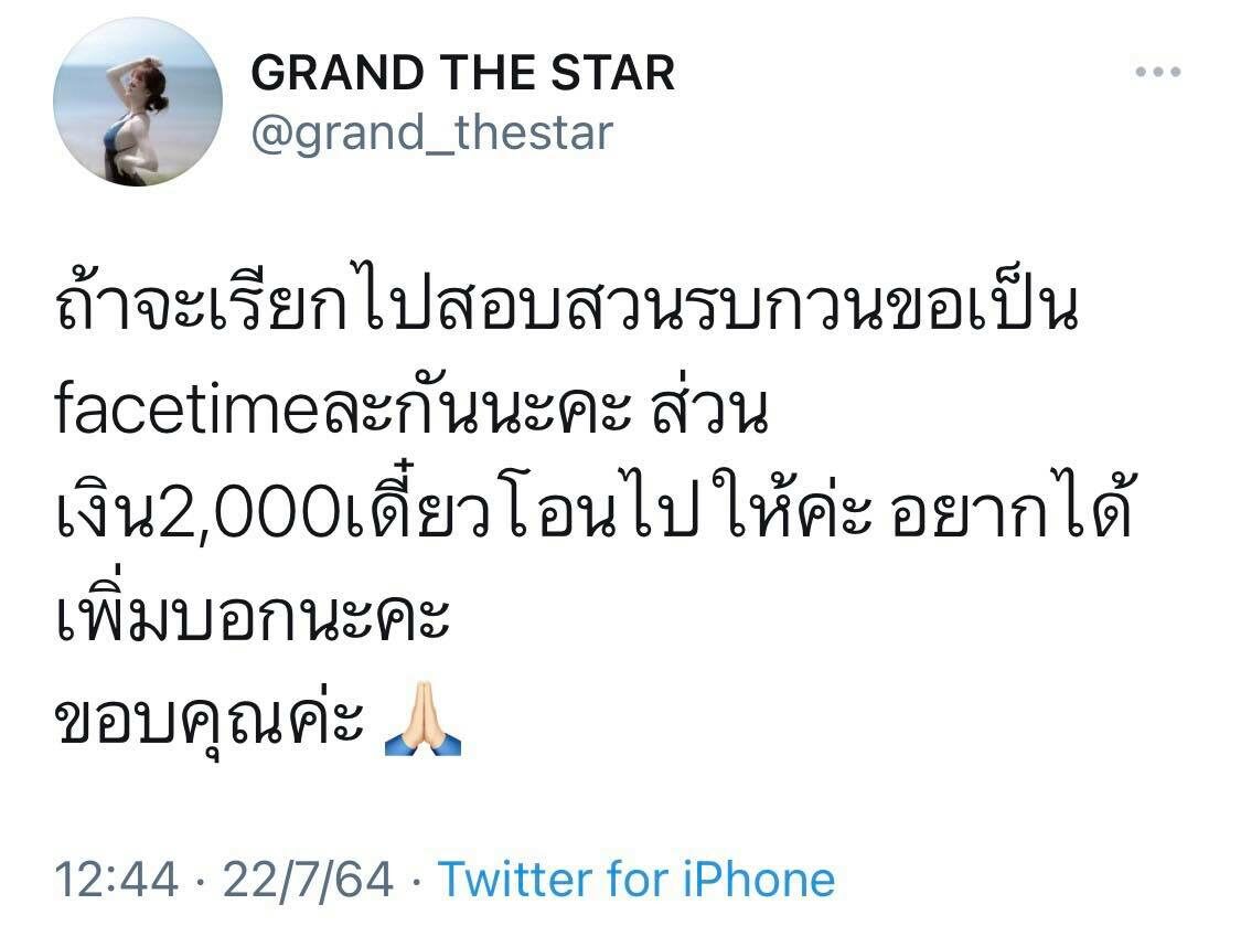 ซึ่งสาวแกรนด์คือหนึ่งในนั้น และเธอได้ ทวิตแบบ แซ่บๆ “ถ้าจะเรียกไปสอบสวนรบกวนขอเป็น facetime ละกันนะคะ ส่วนเงิน2,000เดี๋ยวโอนไปให้ค่ะ อยากได้เพิ่มบอกนะคะ ขอบคุณค่ะ “